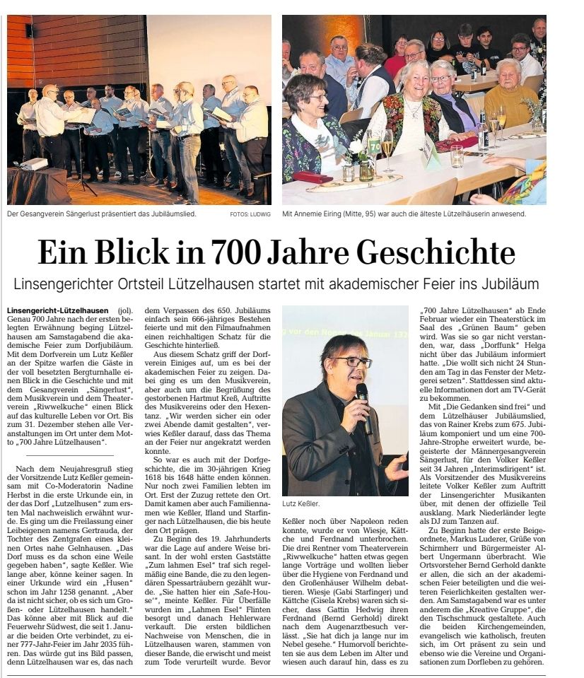 Der offizielle Festakt fand am 3. Januar 2026 statt – auf den Tag genau 700 Jahre nach der ersten urkundlichen Erwähnung. In der vollbesetzten und von der Kreativen Gruppe Lützelhausen festlich geschmückten Turnhalle auf dem Berg erlebten wir einen wundervollen Abend voller Geschichte und Geschichten: mit großartigen musikalischen Beiträgen der Sängerlust Lützelhausen und der Linsengerichter Musikanten sowie einem Auftritt der legendären Lützelhäuser Rentnerbank des Theatervereins Riwwelkuche. Anschließend wurde auf der Tanzfläche mit DJ André bis in die späte Nacht weitergefeiert.